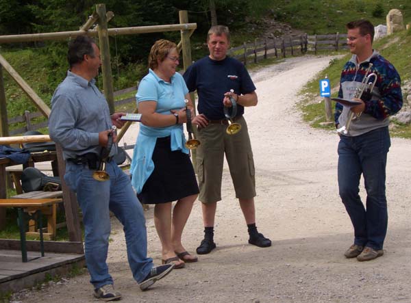 Die nahezu 2-monatige Probenpause ist mit dieser Auftaktveranstaltung zu Ende gegangen. Im Koschuta-Schutzhaus waren wir bestens untergebracht; die Stimmung war ausgezeichnet. Mit einem großen "Stelzenessen" wurde das Probenwochenede gleich deftig begonnen. Zur Überraschung des Hornmeisters hat sich die längere Probenpause nicht sonderlich negativ auf den Ansatz ausgewirkt - offensichtlich haben doch einige auch in der Sommerpause fleißig geübt. Am Samstag-Vormittag stand für geübte Berwanderer noch die Besteigung des Koschutnik-Turmes auf dem Programm. Nach 2 1/2-stündigem Aufstieg konnten Sophie, Uschi, Josef, Ernsti, der Hornmeister und der Obmann etwas abgekämpft aber glücklich den gemeinsamen "Gipfelsieg" feiern. Als Belohnung gab es am Gipfel eine zünftige Jause von Josef.