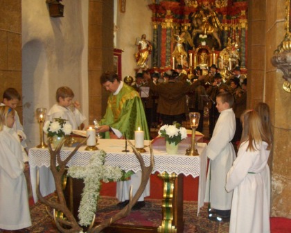 04.11.2007: Hubertusmesse in der Pfarrkirche KöttmannsdorfPfarrer Mag. Michael G. Joham zelebrierte mit der Pfarrgemeinde und vielen Jägern eine sehr feierliche Hubertusmesse. In seiner Predigt, die dem heiligen Hubertus gewidmet war, würdigte er auch das besondere Wirken der heimischen Jä:ger für Wild und Umwelt.Die musikalische Umrahmung durch die Jagdhornbläsergruppe Kö:ttmannsdorf unfasste Kompositionen von Anton Solfellner und Michael Welsch. Die Akustik in der Kirche ist ja bekanntermaßen hervorragend, so dass diese Hubertusmesse auch für uns Jagdhornbläser ein besonderes Fest war. Als kleines Dankeschön überreichte der Obmann dem Herrn Pfarrer einen Jagdhut verbunden mit der Einladung, die Jagdprüfung zu absolvieren und in die Jagdgemeinschaft einzutreten. Anschließend an die Hubertusmesse waren alle Besucher in den Pfarrsaal geladen, wo sie mit Hirschgulasch und Würstl sowie Kaffee und Kuchen verköstigt wurden. > |